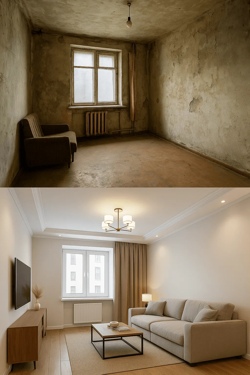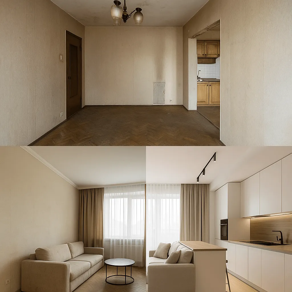 Капитальный. Глубокая модернизация с полным демонтажем покрытий до бетона. Выравнивание поверхностей, замена электрики, труб, сантехники, возможна перепланировка. После черновых этапов — чистовые: отделка, освещение, установка мебели. Длительность — несколько месяцев, результат — полное преображение пространства.