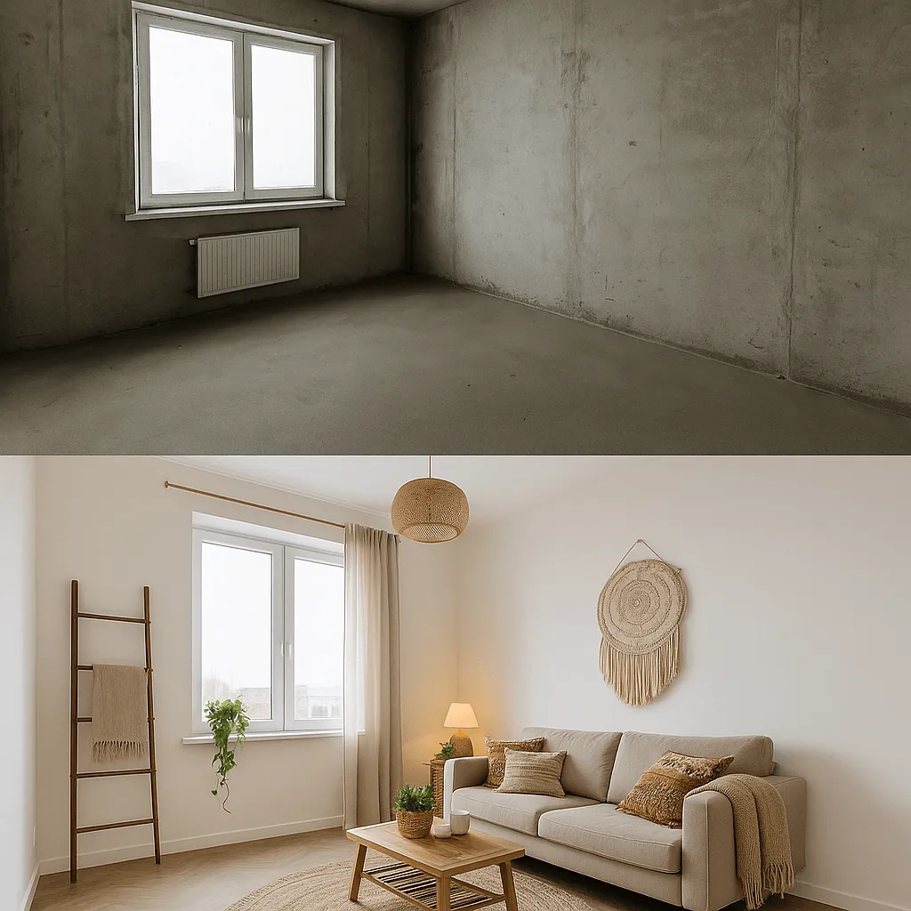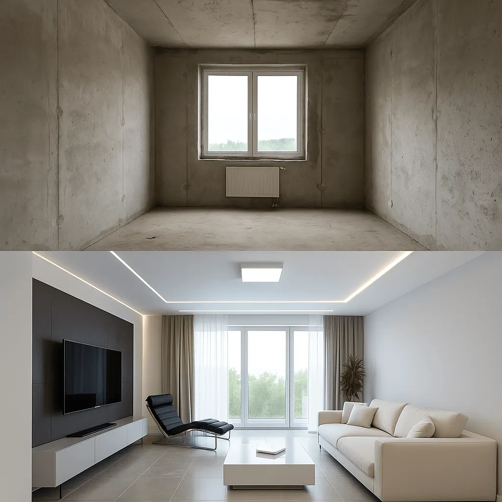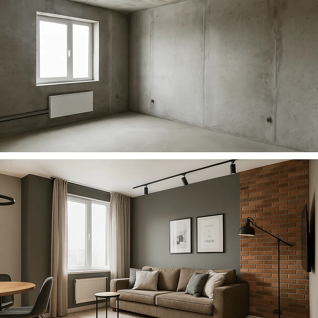 Чистовая отделка. Теперь очередь за эстетикой. Мастера клеят обои или красят стены, укладывают плитку, ламинат, паркет. Устанавливают двери, розетки, светильники, натяжные или подвесные потолки. Это этап, когда жилье превращается в дом. Интерьер оживает, появляются линии, цвет, фактура.