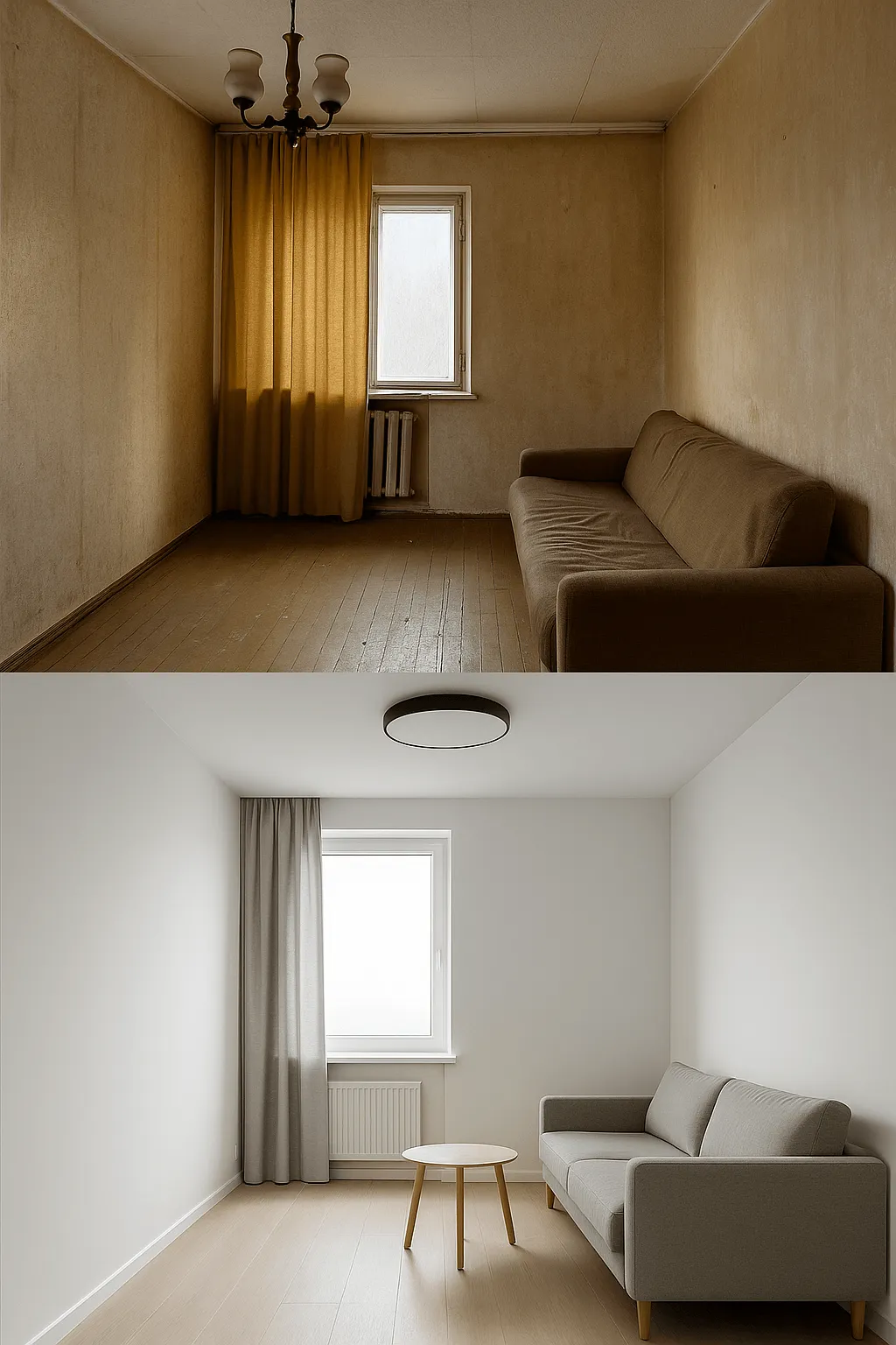 | Косметический ремонт без материалов | Покраска, обои, замена плинтусов, мелкий ремонт | от 12 000 ₸/м² | от 10 дней |