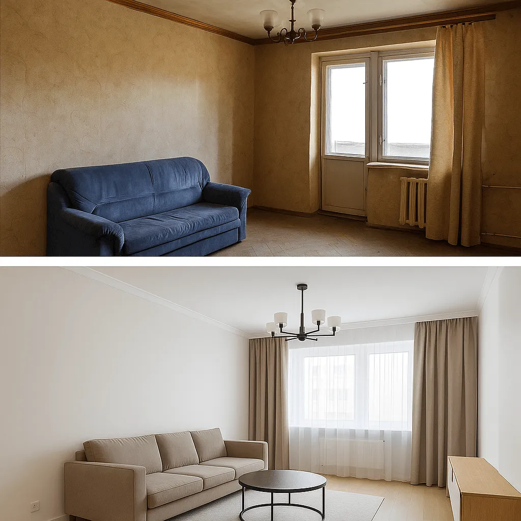 Демонтаж старой отделки, укладка нового покрытия, выравнивание стен и потолка, покупка новой мебели |
