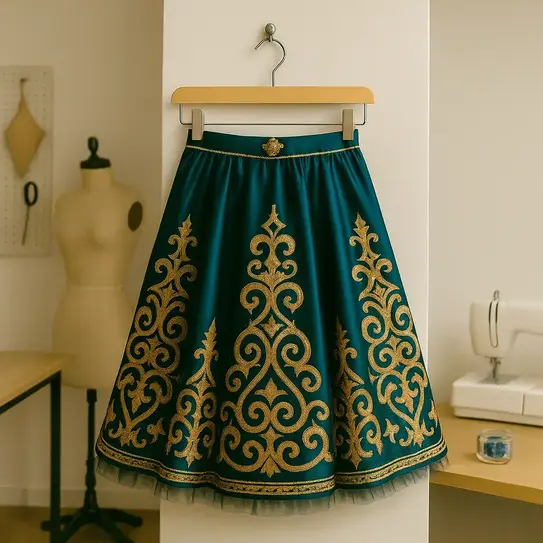Индивидуальный пошив пышной юбки с казахским орнаментом: подбор атласа/сатина, подклад и фатин, декоративная аппликация/вышивка, фурнитура |