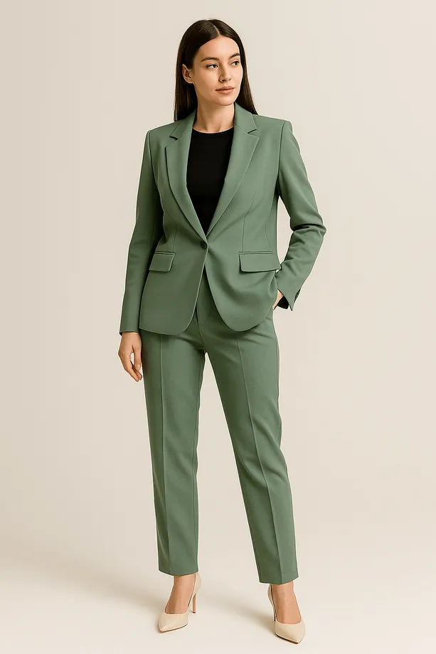 Как изготавливалось | Снятие индивидуальных мерок, разработка лекал с учётом фигуры, пошив женского костюма (пиджак и брюки/юбка), подбор подкладки и фурнитуры, ручная обработка деталей, примерка и финальная корректировка. |