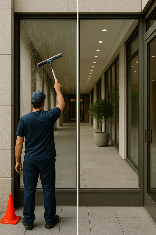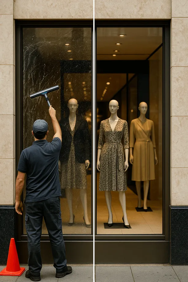 Комплексная очистка сильно загрязнённых витрин, включая труднодоступные зоны