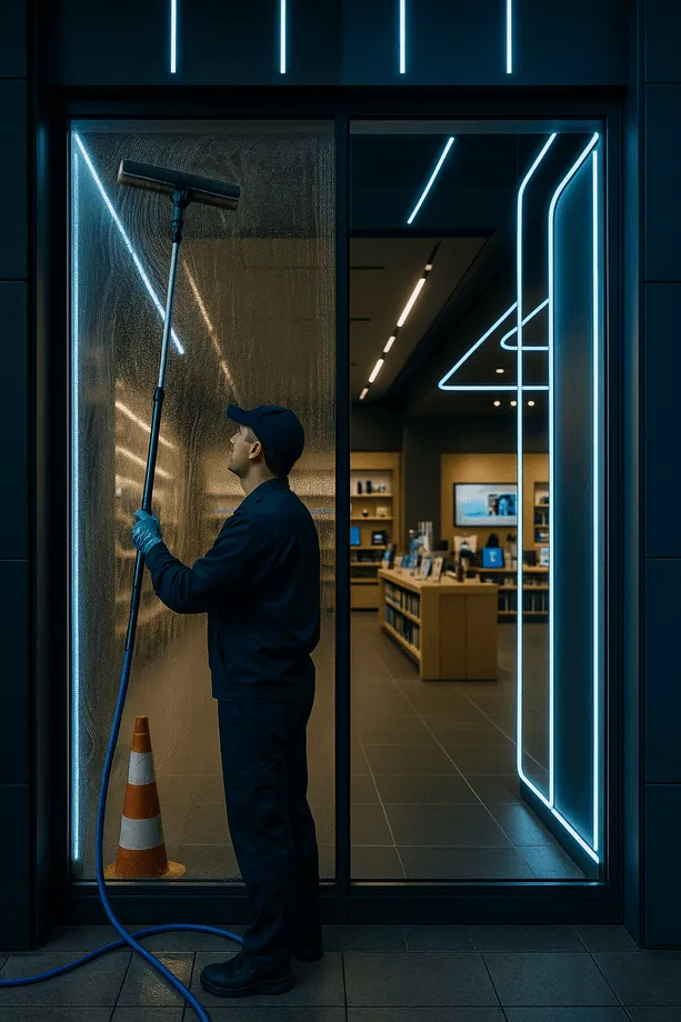 Система «чистой воды» TDS 0–5 ppm и штанги до 20 м позволяют убирать стекло и вывески без подтёков. Работаем до 6 этажей за 1 цикл.