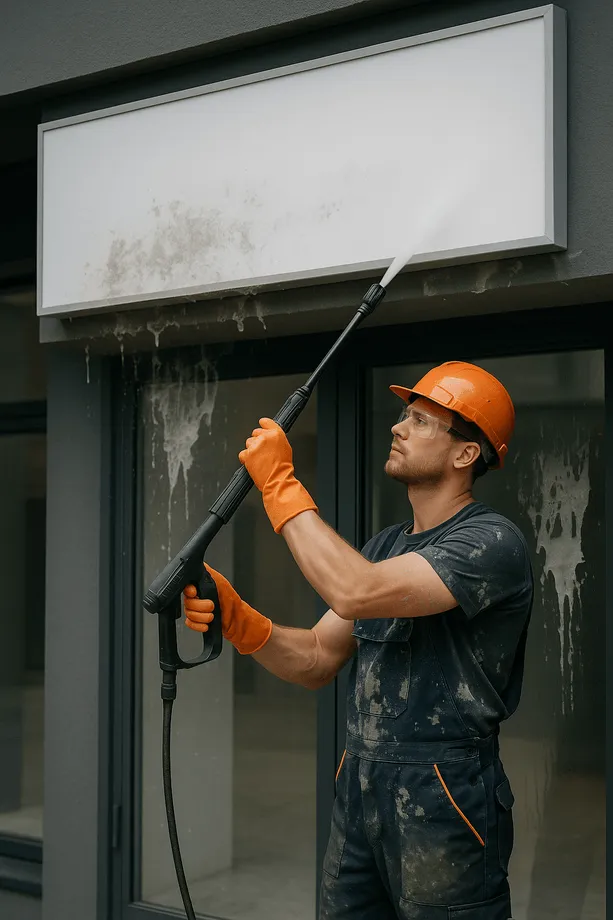 | Мойка вывесок после стройки/ремонта | Удаление цемента, краски, скотча и стойких загрязнений | от 700 ₸/м² | от 1–2 дней |