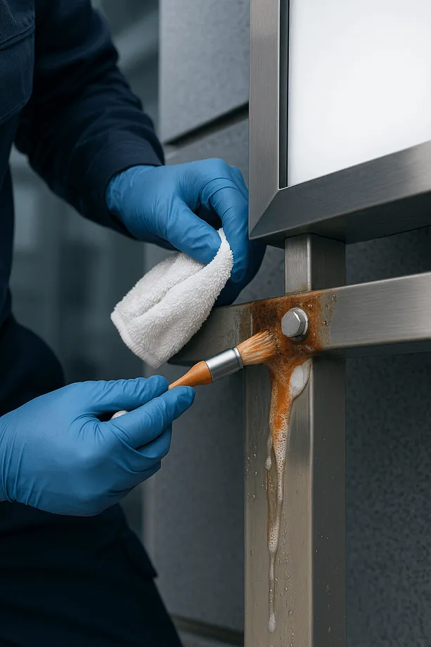 | Удаление ржавчины и налёта с вывесок | Химическая обработка и защита поверхности | от 800 ₸/м² | от 1–2 дней |