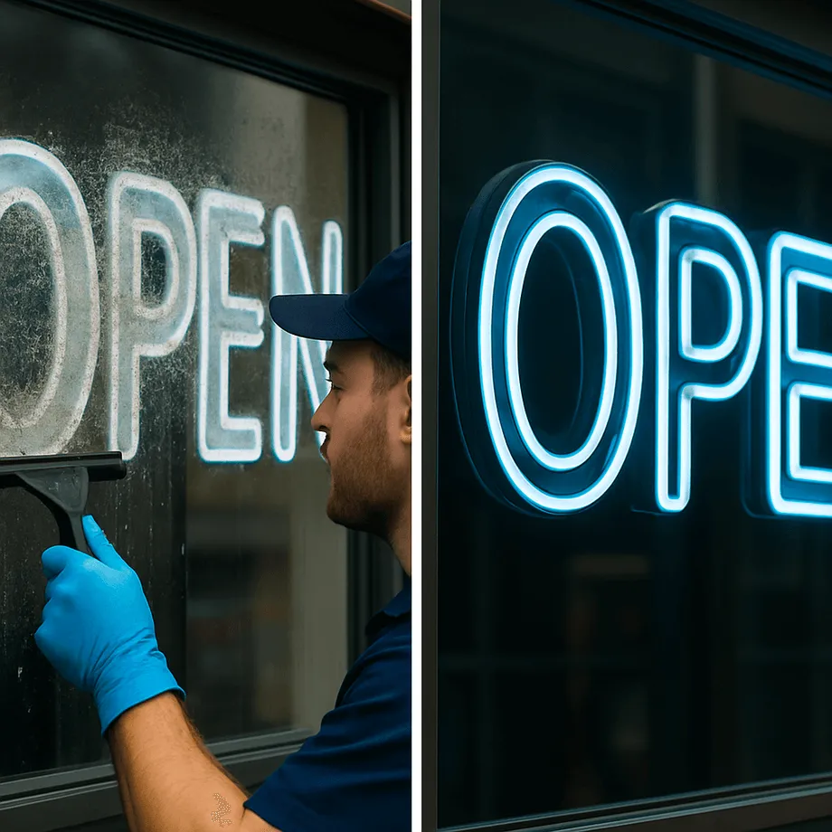 По данным клиентов, после мойки световых вывесок трафик вырос до 30%. Чистая вывеска привлекает внимание и возвращает яркость бренду.