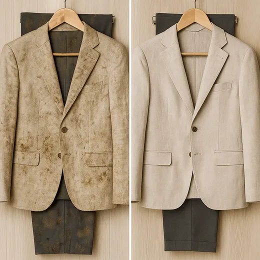 Деловой комплект быстро теряет свежесть. Даже если он кажется чистым, внутри оседают частицы пыли, пота, кожного жира. Эти загрязнения портят структуру ткани, влияют на посадку, вызывают запах. Домашняя обработка проблему не решает. Пиджаки, брюки теряют форму, садятся, тускнеют. Особенно страдают натуральная шерсть, швы, подкладка. Вещи теряют вид, выглядят уставшими.