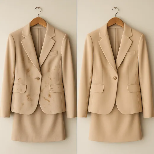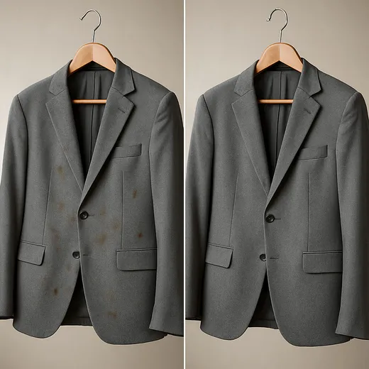 87% костюмов очищаются с первого раза. Выводим жир, кофе, косметику, пыль с воротника — без следов и разводов.