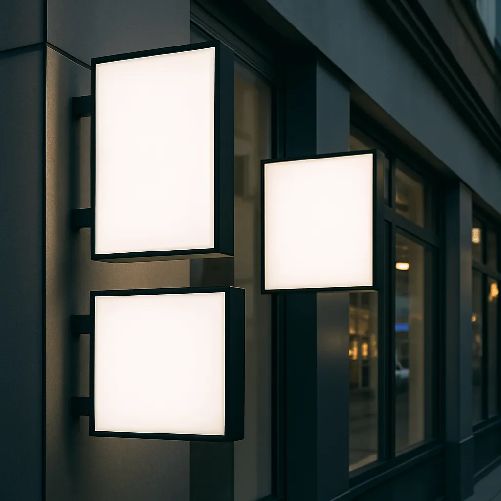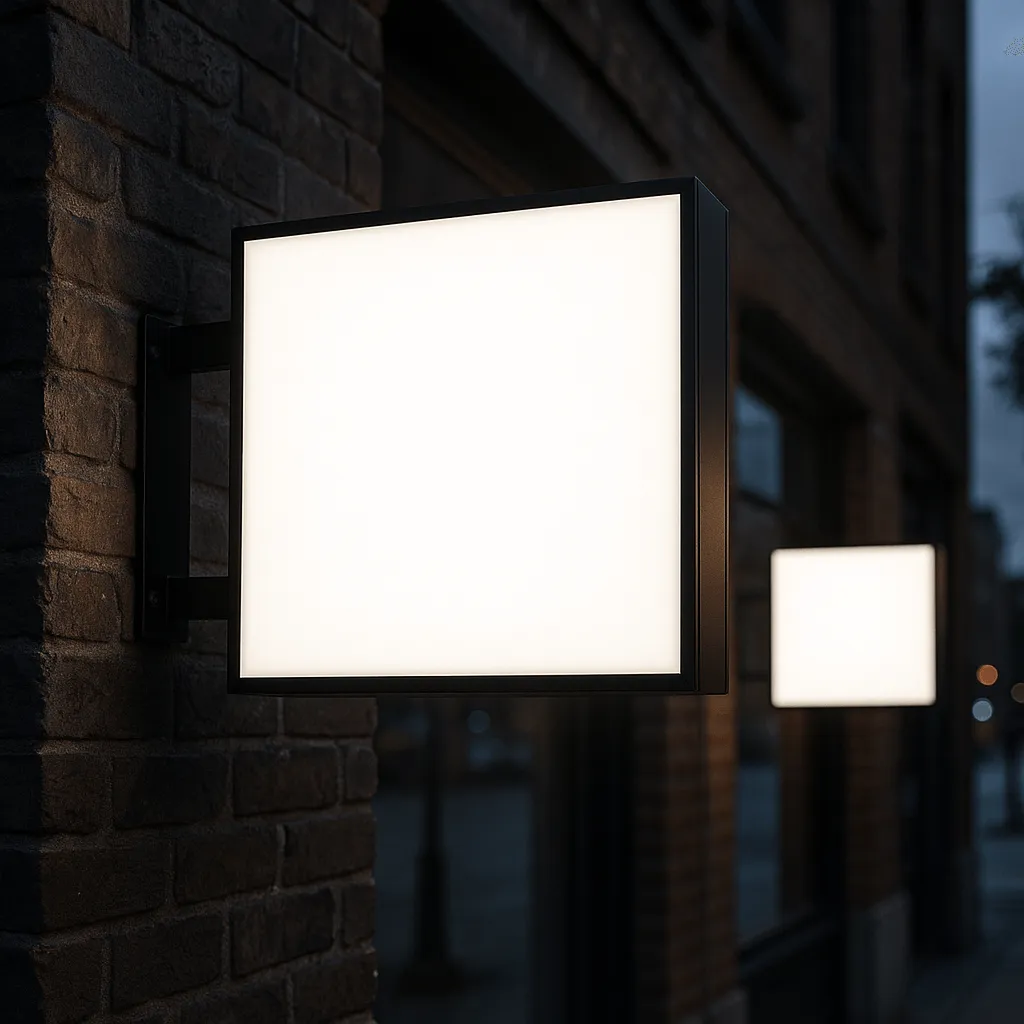 Различаются лайтбоксы и по количеству рабочих сторон. Если нужно, чтобы вывеску было видно с разных направлений, оптимально подойдет двухсторонний световой короб. В таком варианте изображения или текст наносятся на обе стороны, а внутри размещается усиленная подсветка. Двусторонние модели часто устанавливают перпендикулярно стене на выносных кронштейнах – тогда вывеска хорошо заметна и пешеходам, и транспорту, движущемуся с обеих сторон улицы. Если же ваша вывеска обращена только фронтально к зрителю (например, фасадная панель над входом), достаточно одностороннего варианта, где все оборудование размещено внутри задней стенки.