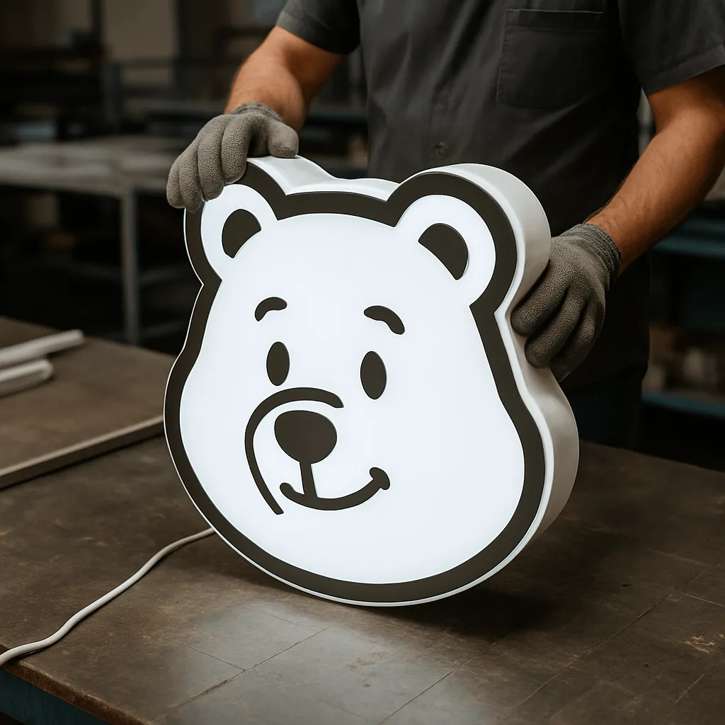 На следующем этапе начинается производство. Каркас короба изготавливается из прочного, но лёгкого материала (например, алюминия или ПВХ-пластика), чтобы конструкция была надёжной и не отягощала фасад. Лицевая панель делается из специального светорассеивающего акрила, на который наносится графика – как правило, печатью на виниловой плёнке. Внутрь устанавливаются светодиодные элементы для равномерной подсветки. Яркие LED-лампы экономично потребляют энергию и рассчитаны на годы работы.