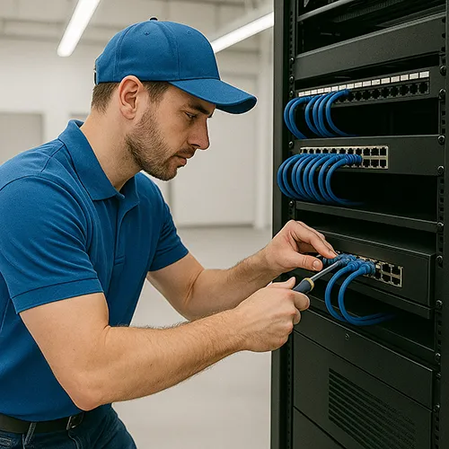 После физической сборки «голая» инфраструктура бесполезна. Настройка локальной сети — это процесс, который вдыхает в нее жизнь. Инженер выполняет конфигурацию активного оборудования: настраивает VLAN для логического разделения отделов (бухгалтерия, отдел продаж), правила безопасности (брандмауэры), приоритезацию трафика (QoS) для VoIP-телефонии и видеоконференций, а также разворачивает беспроводную Wi-Fi. Грамотная настройка обеспечивает не только скорость, но и безопасность внутренних данных. Это финальный и крайне важный штрих.