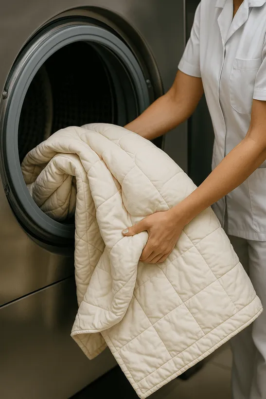 - Промышленная стирка с дезинфекцией и контролем pH, щадящие режимы.