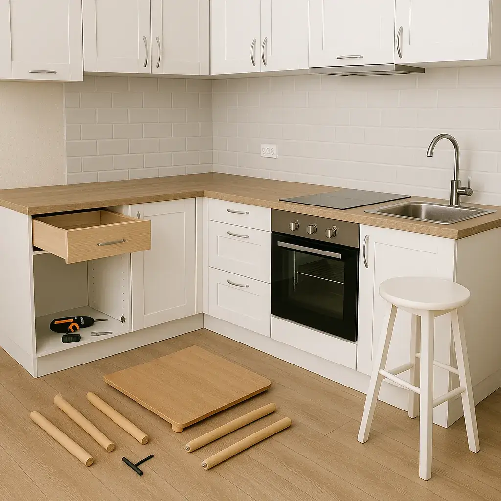 | Кухня модульная (сборка гарнитура) | от 15 000 | 1 день и более | Сборка модулей, выставление по уровню, стыковка столешниц | Врезка техники и сантехники, подпилы, стеновые панели |