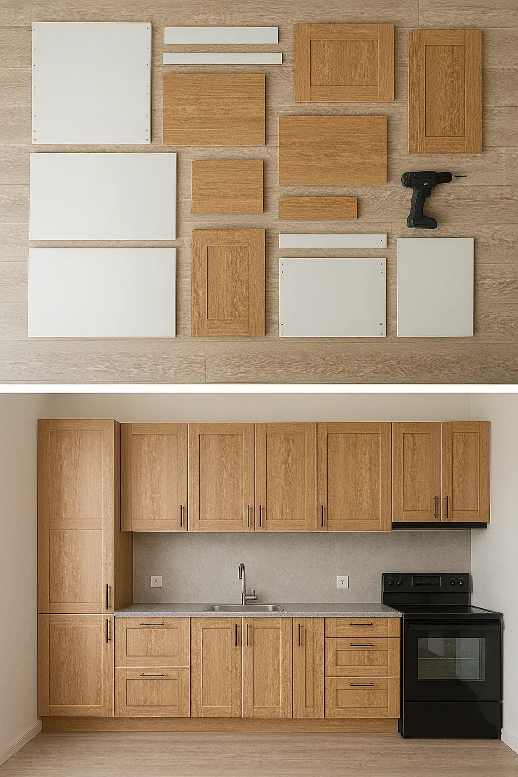 Полная сборка новой кухни из отдельных модулей и элементов |