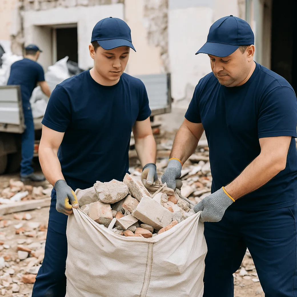 Что это значит на практике? Сотрудники самостоятельно собирают, выносят содержимое квартиры, дома, участка. Грузят мешки, предметы в наш транспорт, вывозят, утилизируют. Участие клиента не требуется — мы привозим все необходимое: мешки, носилки, инструмент для демонтажа. После загрузки можем подмести территорию.